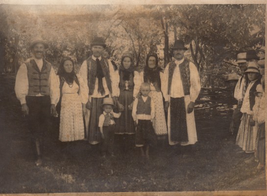 Balról: Tóth Gergely "bambuc" és felesége Ilona; Sajgó Miklós szülei és testvére Marci; Sajgó Ferenc "jancsijankó" és szülei. A kép szélén még négy személy. A képen látható személyek szomszédok voltak.