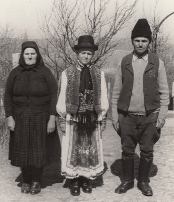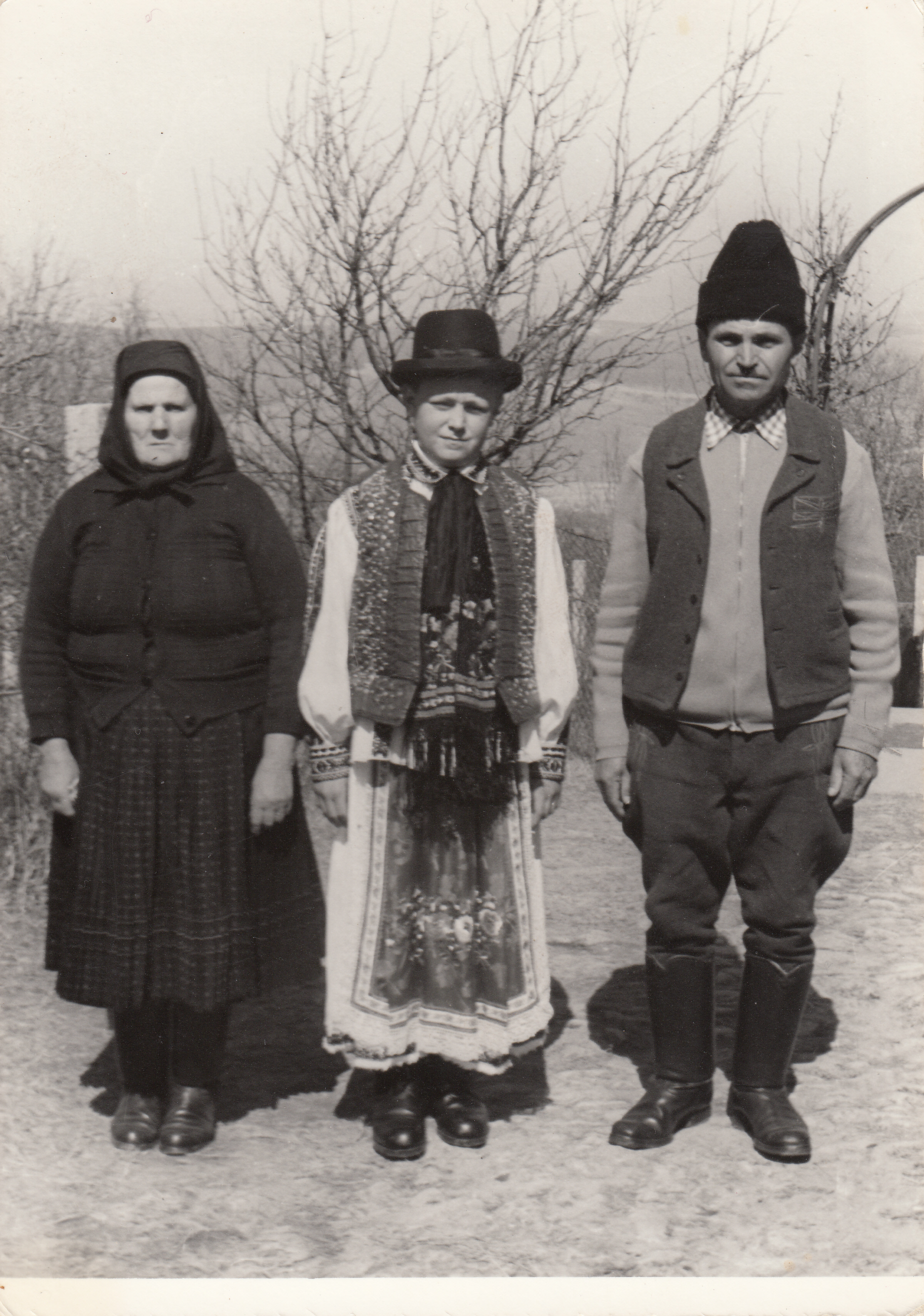 Egy györgyfalvi idős pás és egy viseletbe öltözött fiú. Konfirmációi képnek látszik, háttérben a temető kapú.